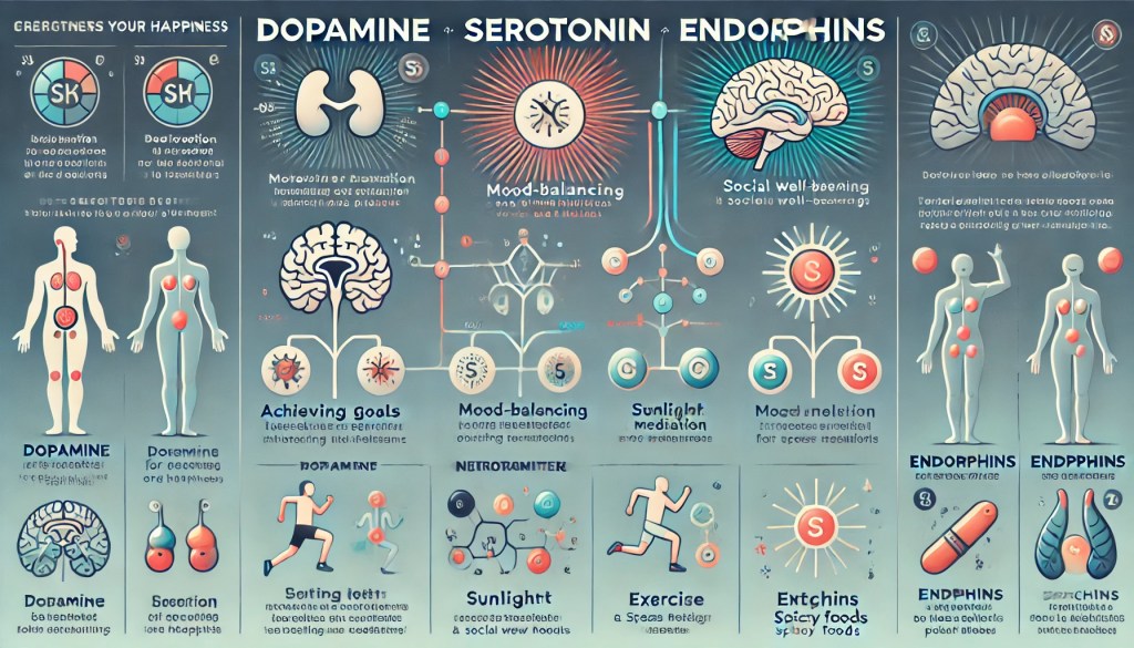 Scientific studies confirm that certain behaviors can enhance these neurotransmitters. For example, regular exercise boosts dopamine and endorphin levels, while gratitude practices increase serotonin activity. It can be difficult to find one activity that boosts all 3 at the same time, so it important to diversify your daily routine to include at least one activity that for each. What activity relies on your own preferences and tastes, mix and match until you strike gold.